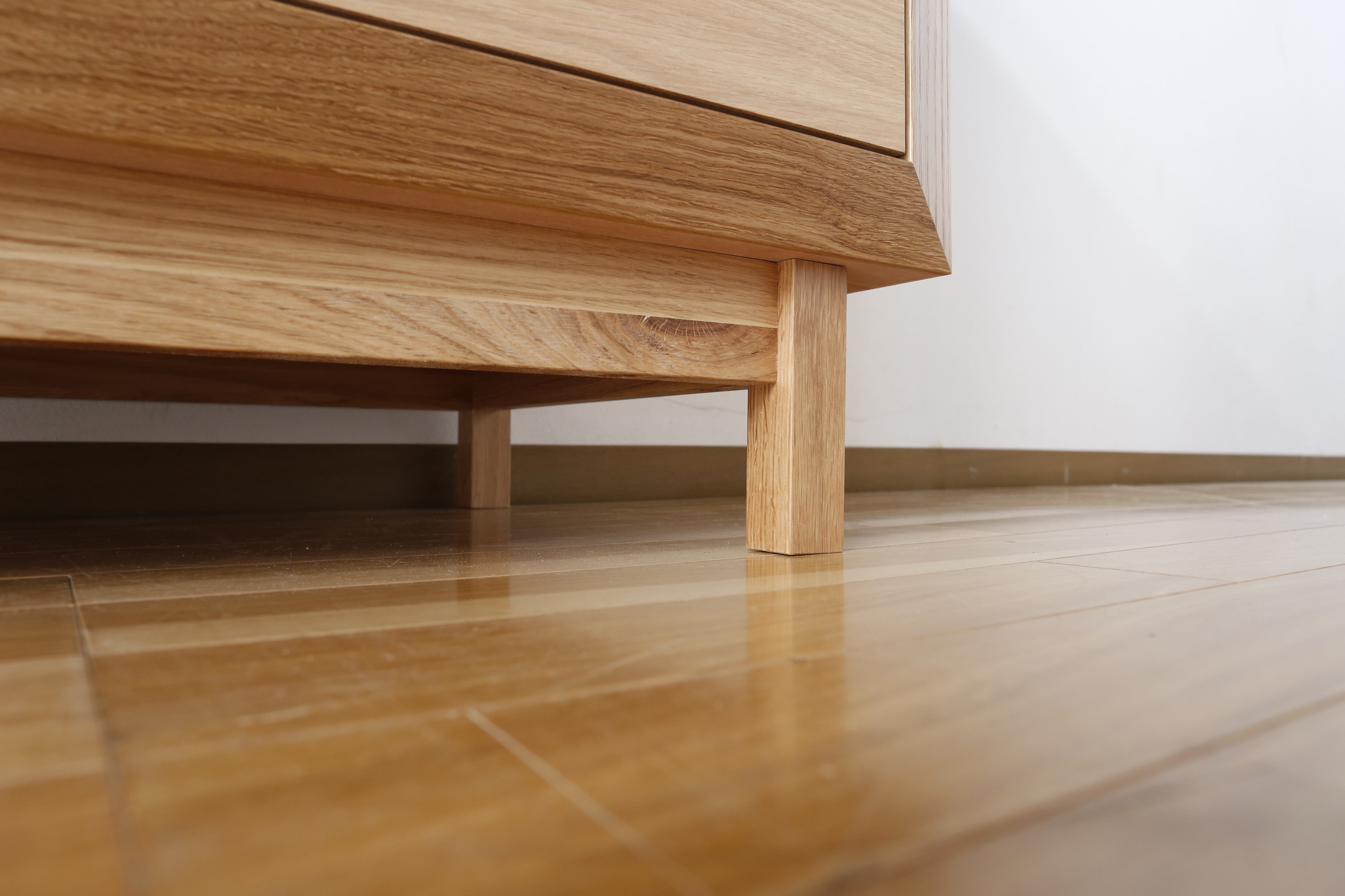 美しいホワイトオークの木目を前面に表現し、四隅はトメ加工をほどこすことで、額縁の天然目アートのような作品にも見える一品となっております。シンプルでありながら収納は大容量。スッキリしたデザインでありながら実用的です。