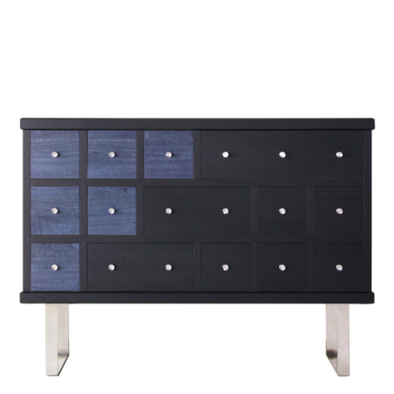 ブラック染色された本体に、日本古来の色をアクセントカラーにして変化をつけたチェスト「モデルナ」