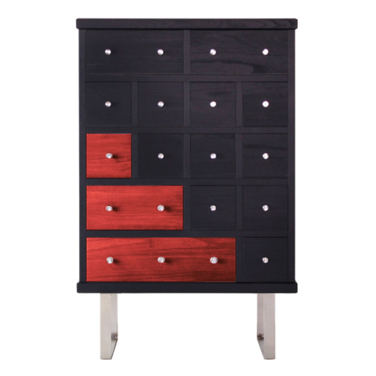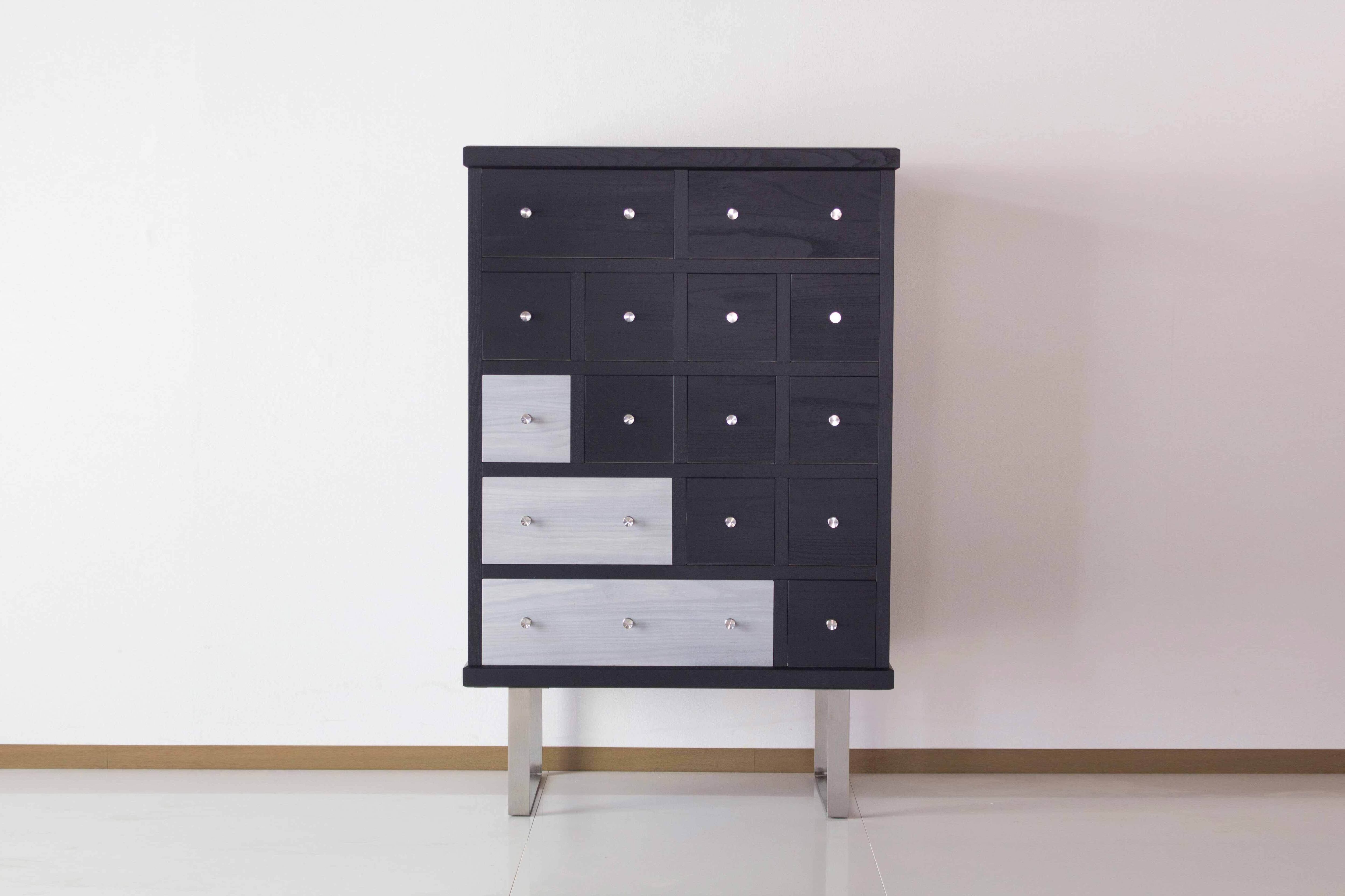 ブラック染色された本体に、日本古来の色をアクセントカラーにして変化をつけたチェスト「モデルナ」