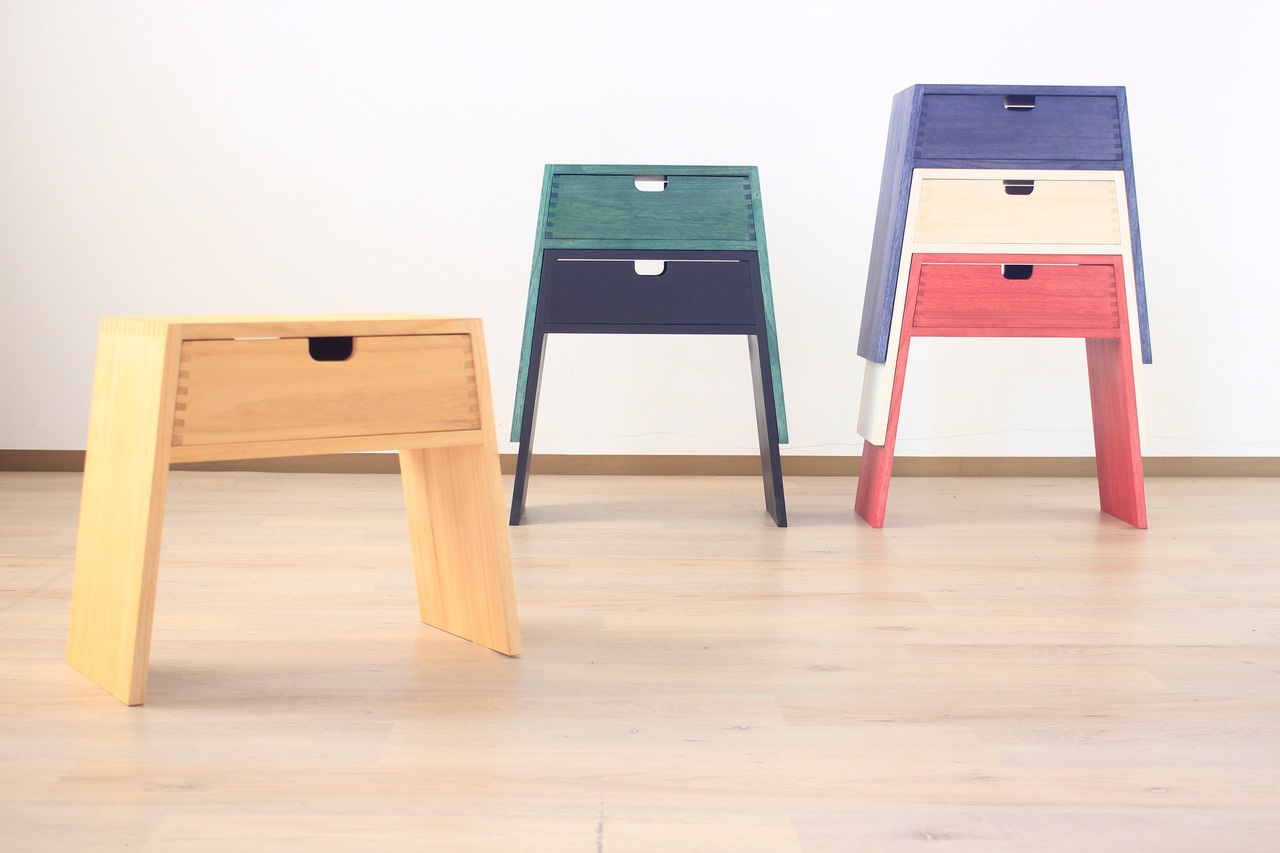 スタッキングスツールにはA4用紙が入るトレイ付き、両面から引き出すことができ、座面の上にぴったり置けるサイズ。