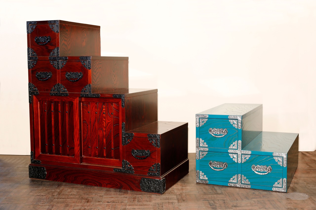 日本の伝統的な技術を活かした【民芸ネコ家具 ネコの階段箪笥 朱】