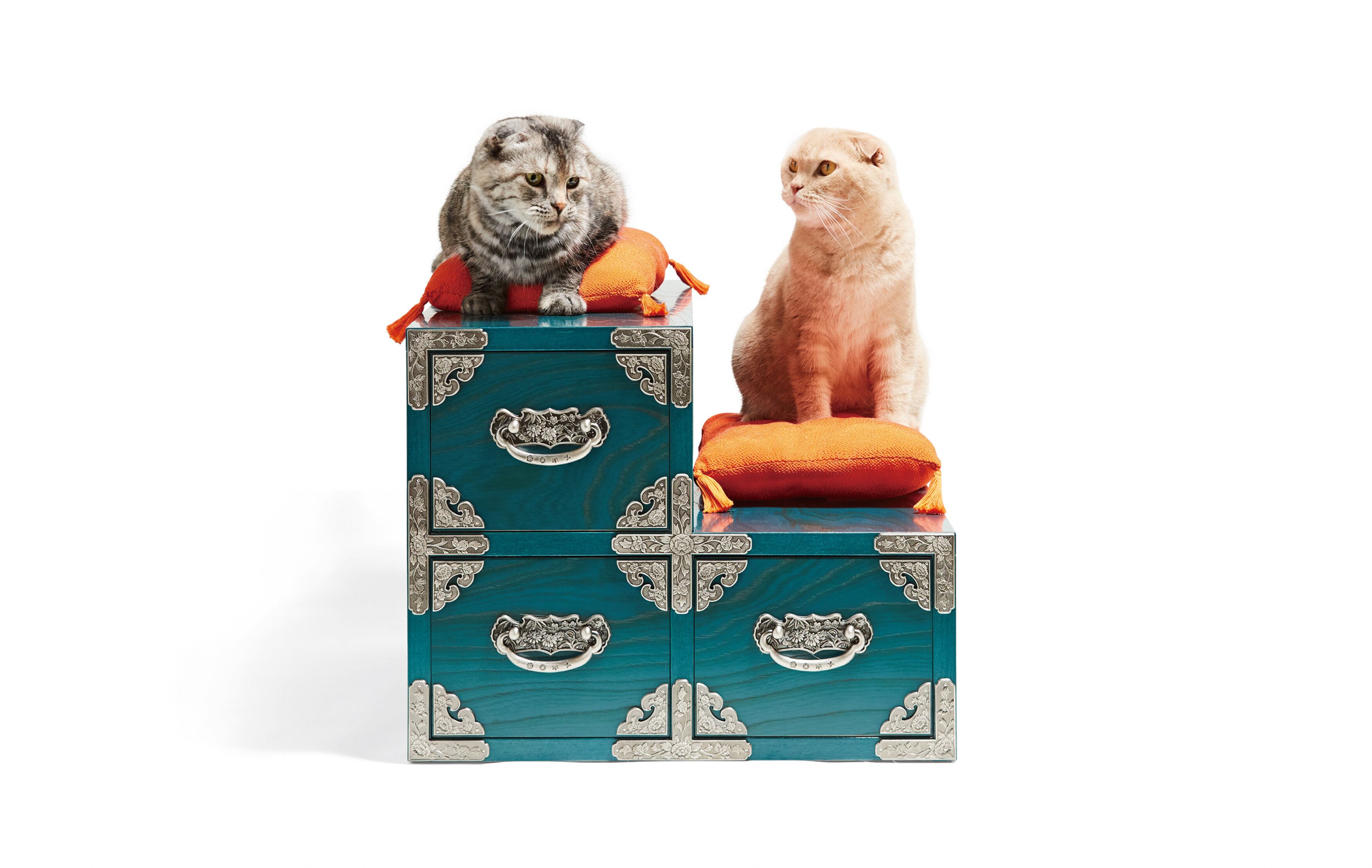 日本の伝統的な技術を活かした【民芸ネコ家具 ネコの階段箪笥 青磁】